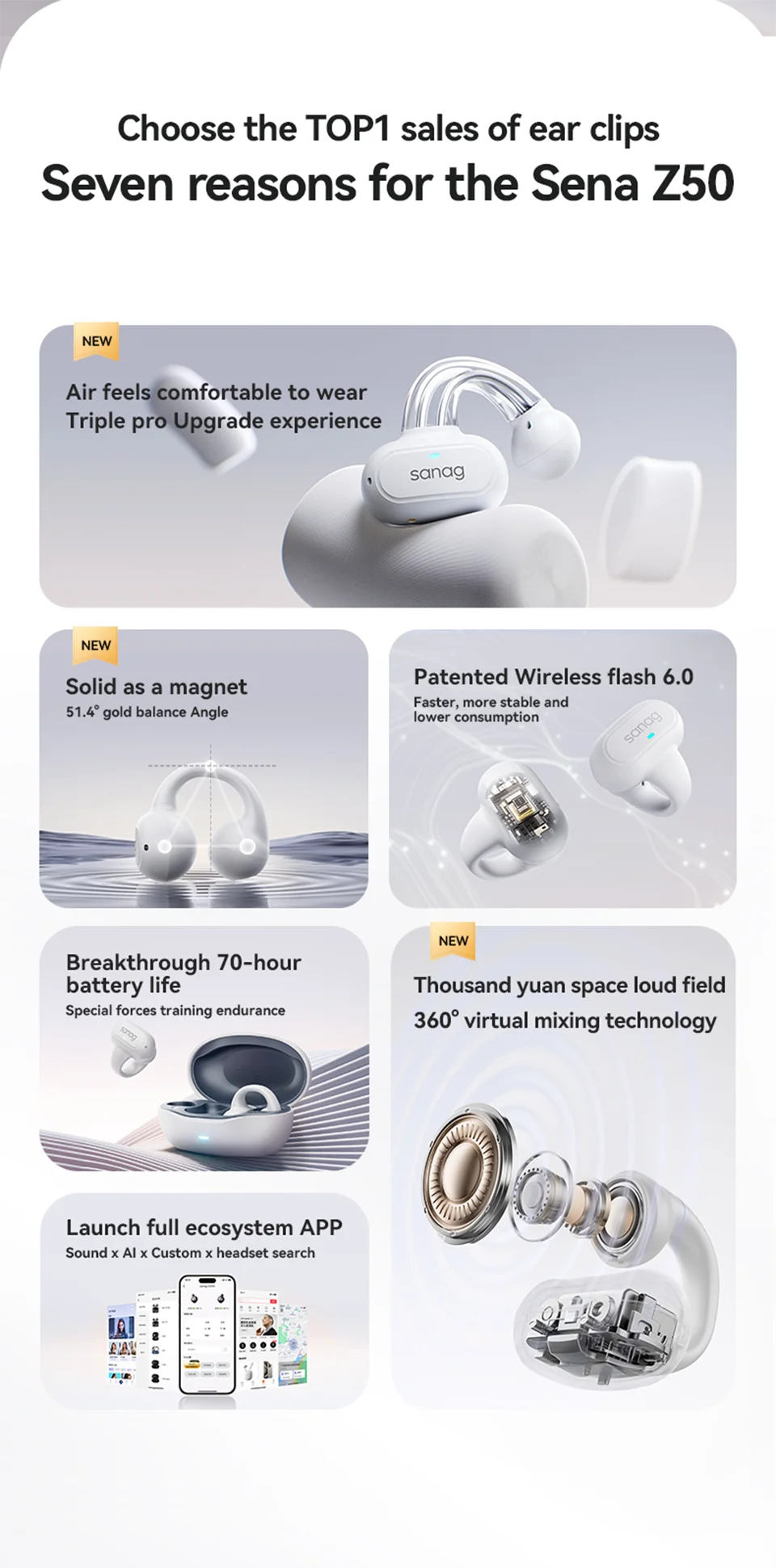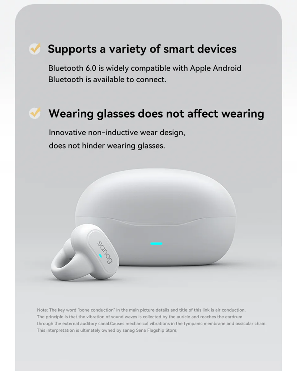 Enjoy smart wireless audio with the Sanag Bluetooth 5.3 Ear Clip Wireless Earphones — lightweight, comfortable earbuds designed for all‑day use with up to 48 hours of total playback. With easy ear‑clip style, dual device connection, smart assistant support, and customizable sound via app, these true wireless earphones combine convenience and performance for music lovers, commuters, gamers, and everyday listeners.