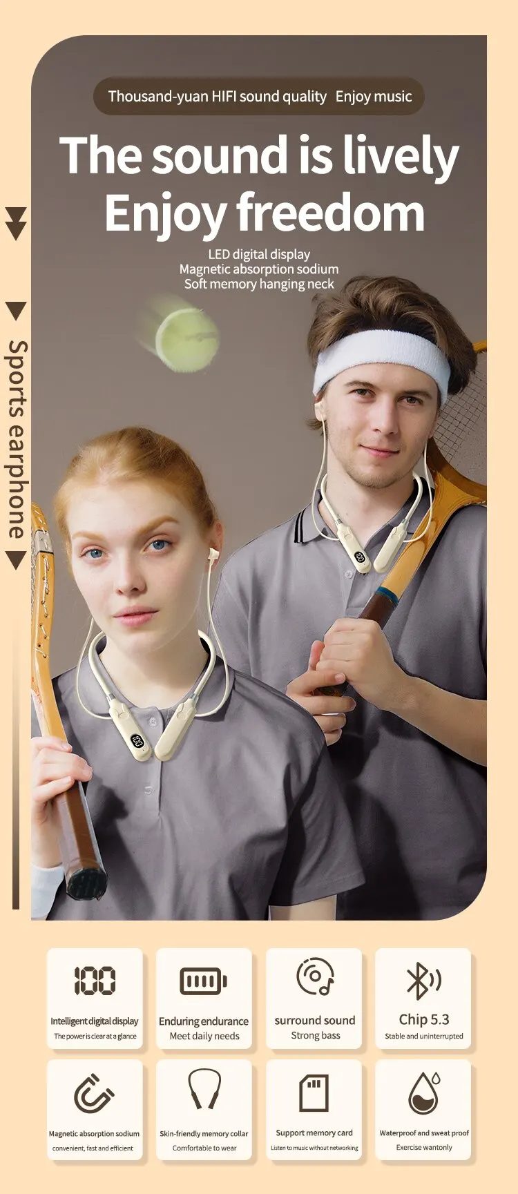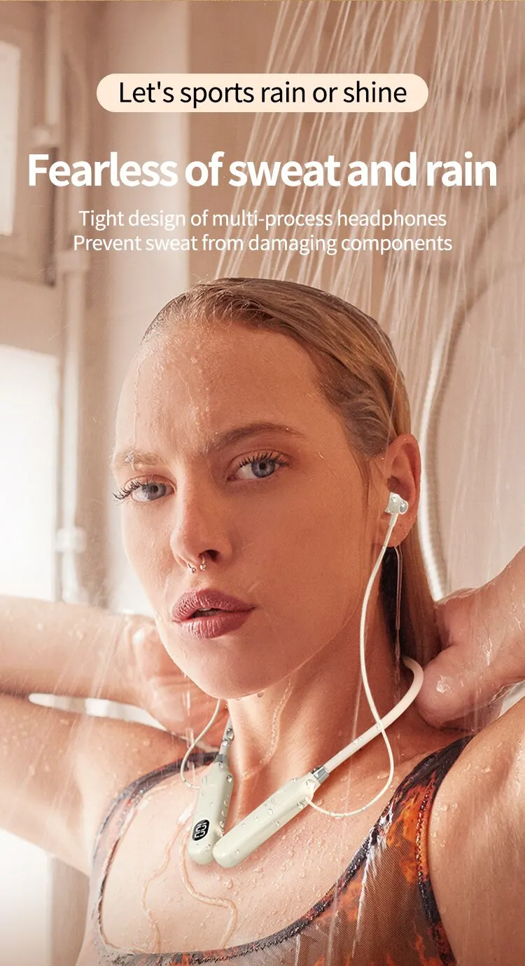 BT-12 Bluetooth 5.3 wireless neckband earphones with touch control display, 50-hour battery, dynamic sound, and sweat-resistant sports design