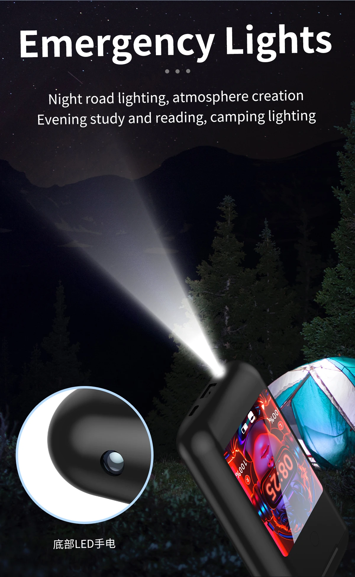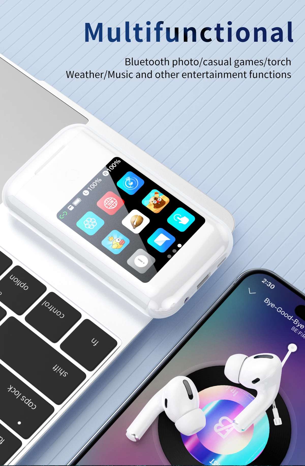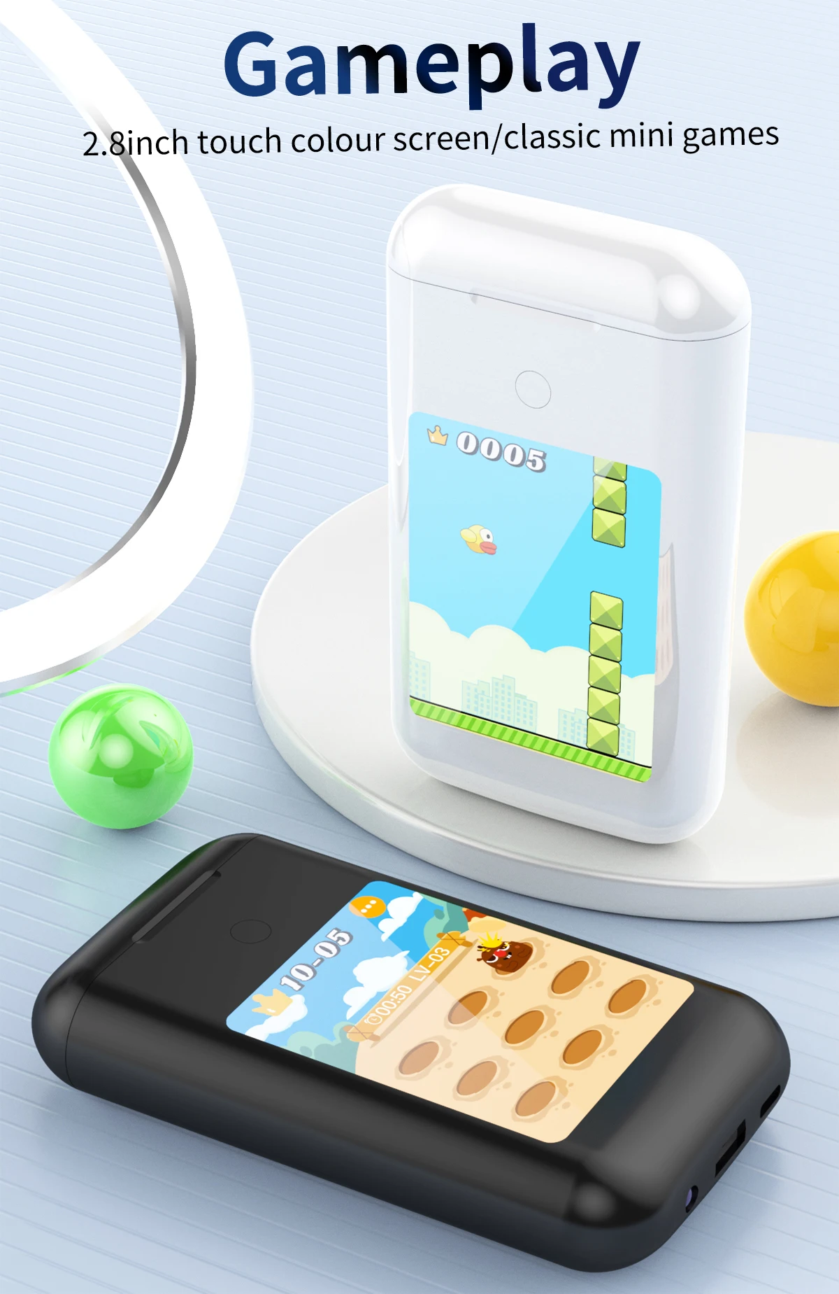 Three Functions in One Device – Bluetooth earbuds, digital display power bank, and touchscreen MP4 player with mini games.