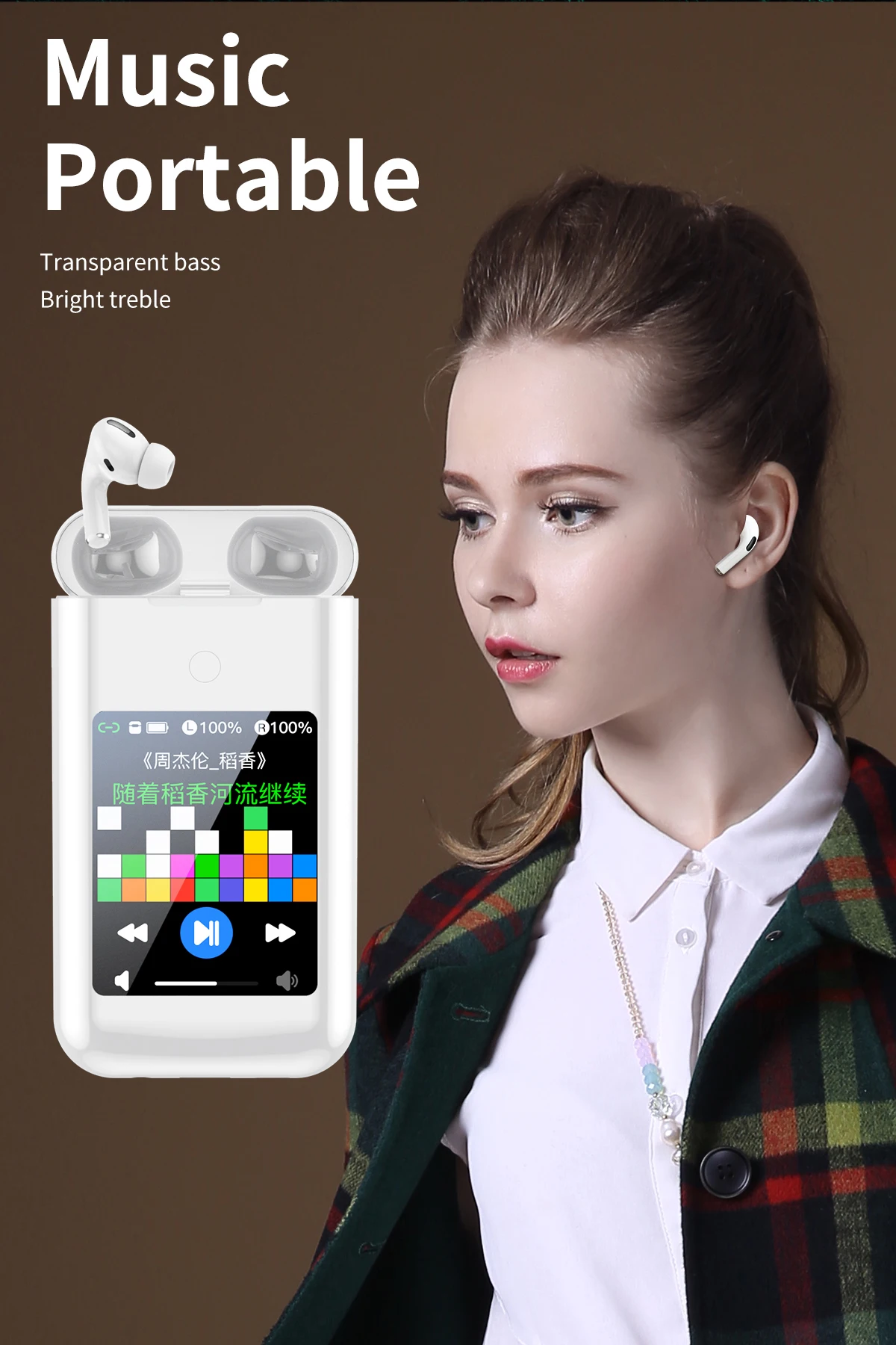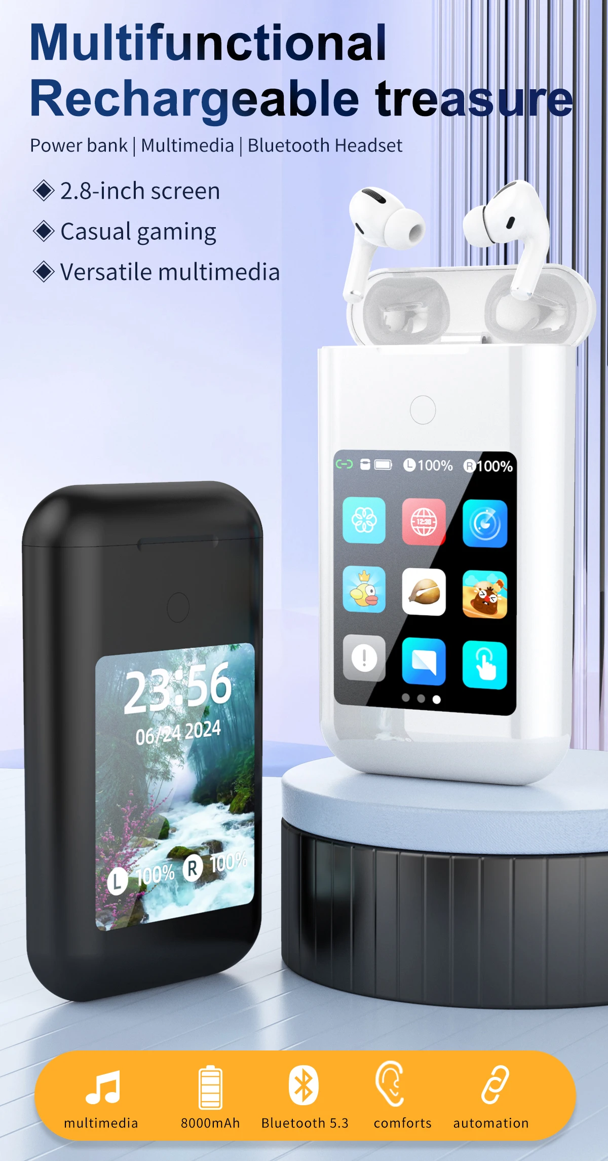 SIMSONLAB Bluetooth 5.3 TWS earbuds with 8000mAh power bank, touchscreen MP4 player, speaker mode, and Hi-Fi stereo sound
