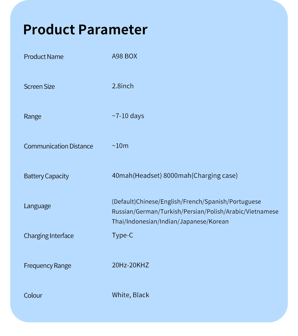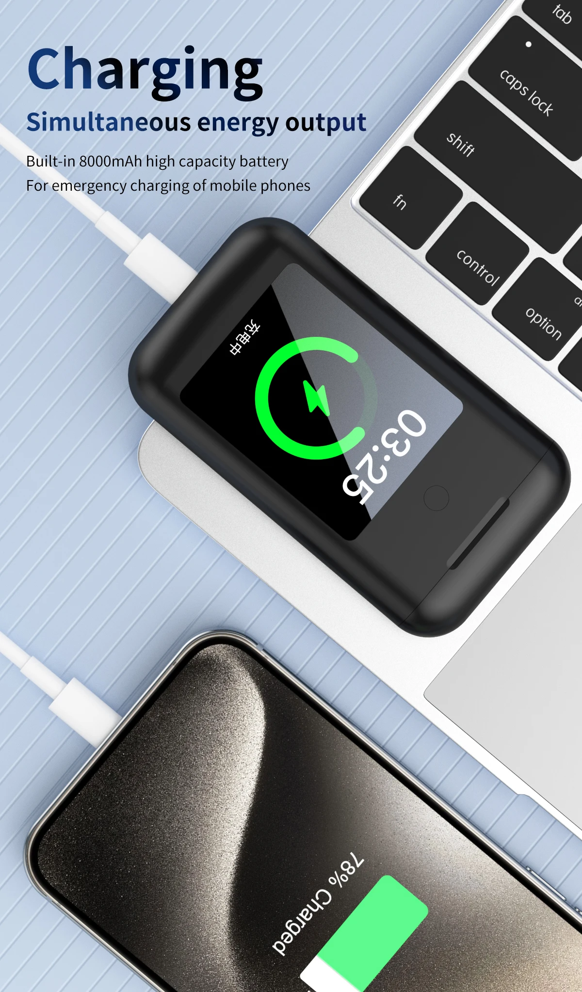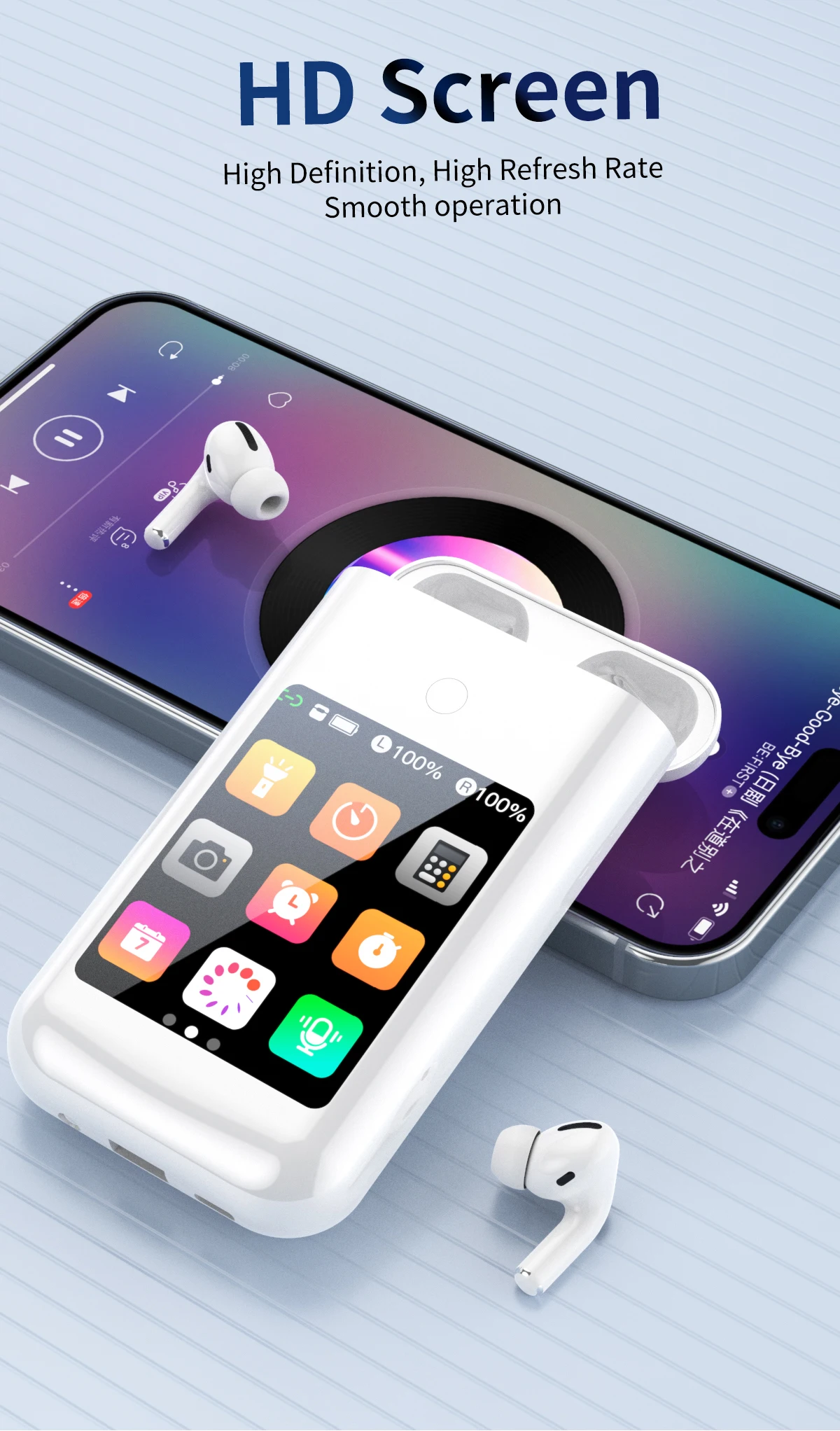📦 Includes: TWS Earbuds, 8000mAh Charging Case with Touchscreen, Type-C Cable, User Manual.