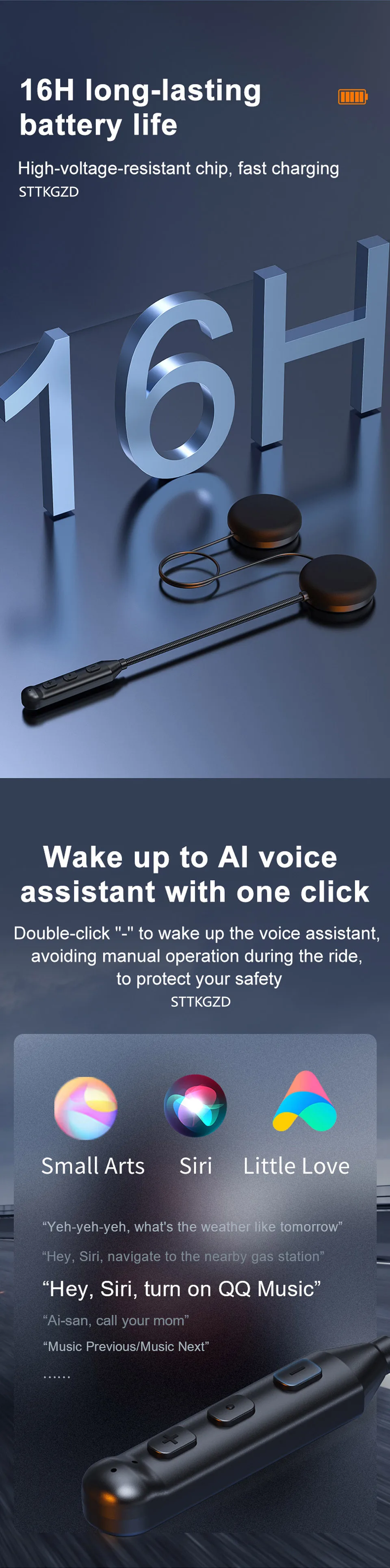 STTKGZD helmet Bluetooth headset with active noise cancellation, ENC microphone, waterproof design, and 16-hour battery life for cycling and motorbikes