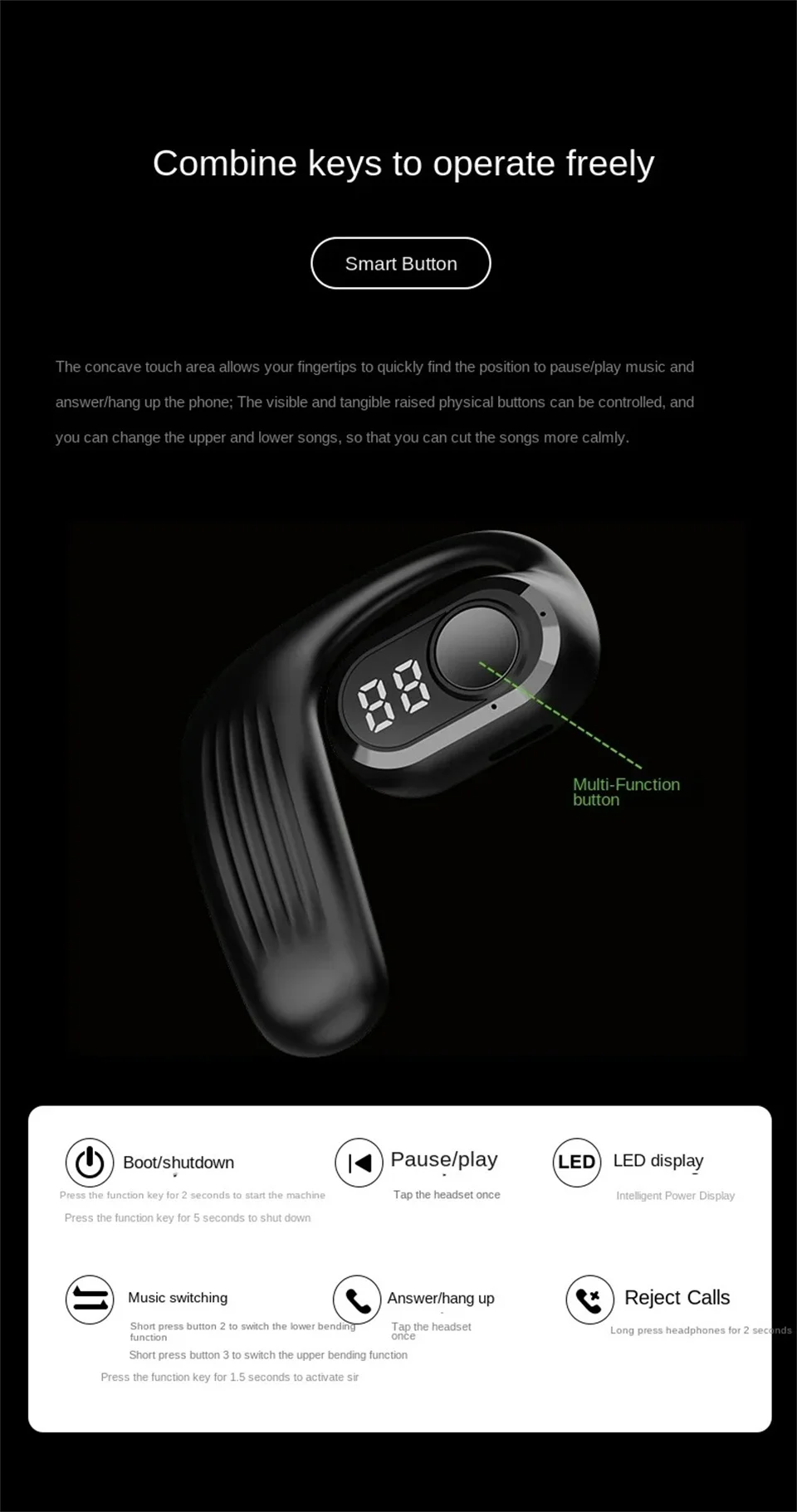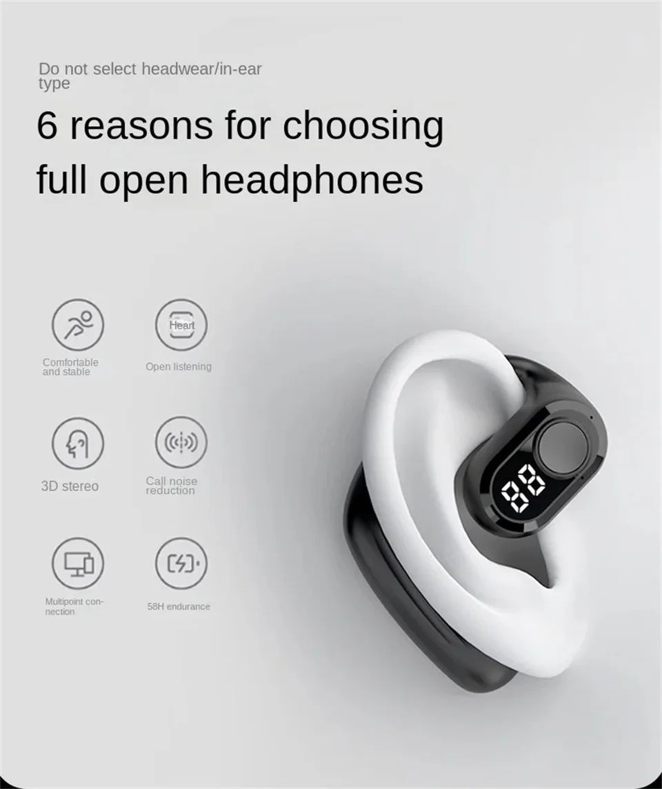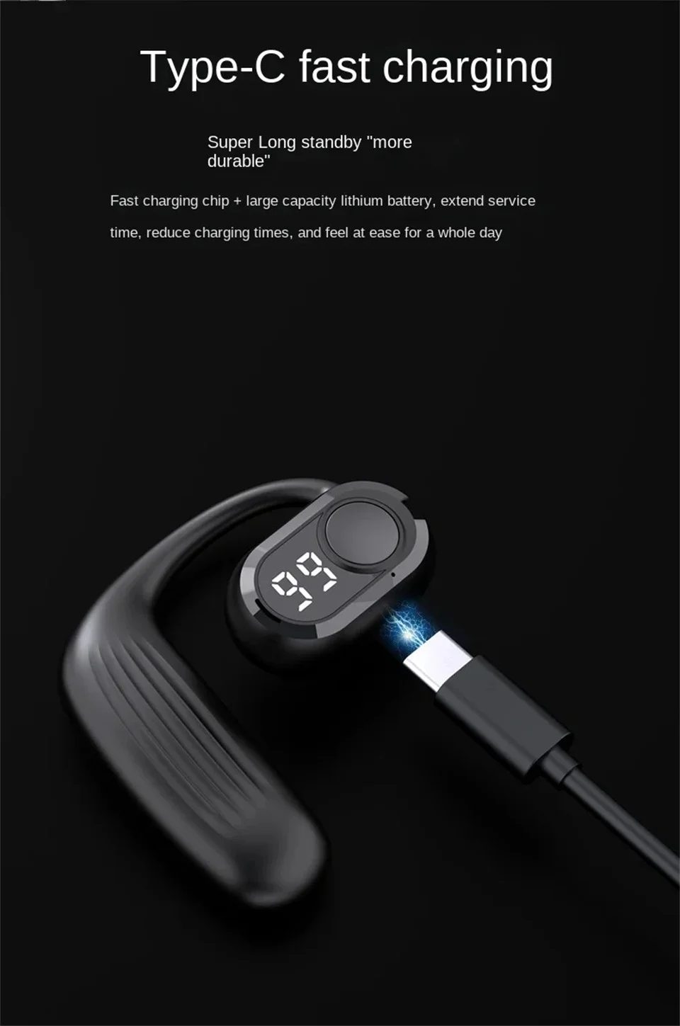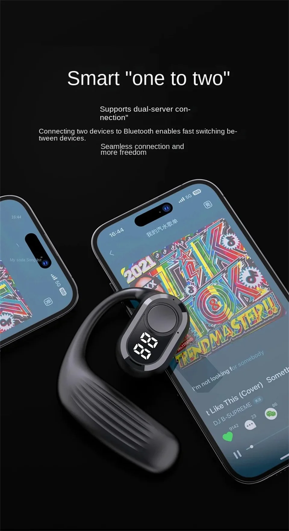 STTKGZD open-air conduction Bluetooth 5.3 headset with dual-mic ENC, LED display, and ear hook design for hands-free calls and sports